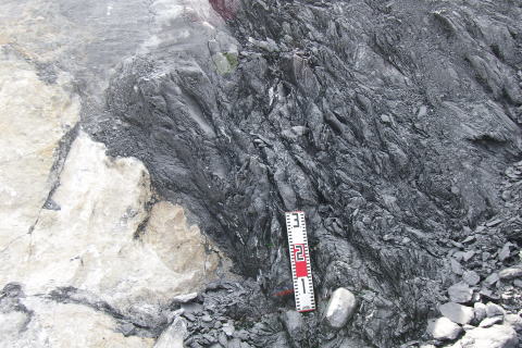 | 断層面も露出してました(横山俊治・撮影) | その断層面には条線もはっきり見えました(横山俊治・撮影) |